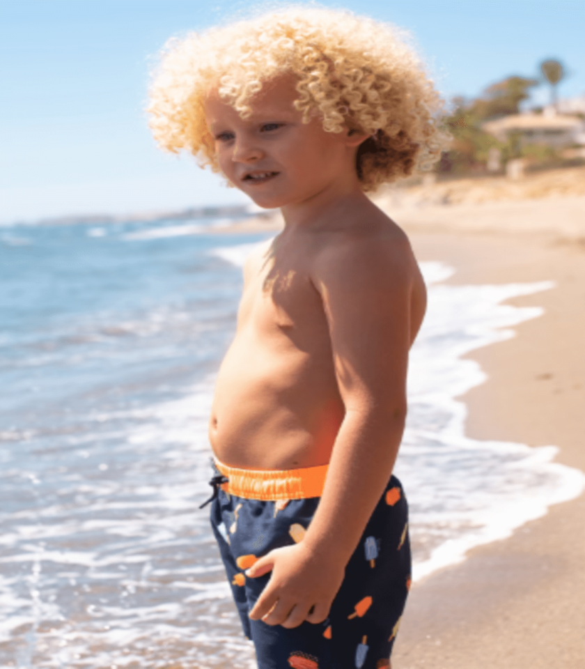 Prenda ECOFRIENDS 100% Poliester reciclado. Bañador bermuda para niño. Cintura con cordón interior ajustable. Bolsillo trasero funcional. Diseño estampado.