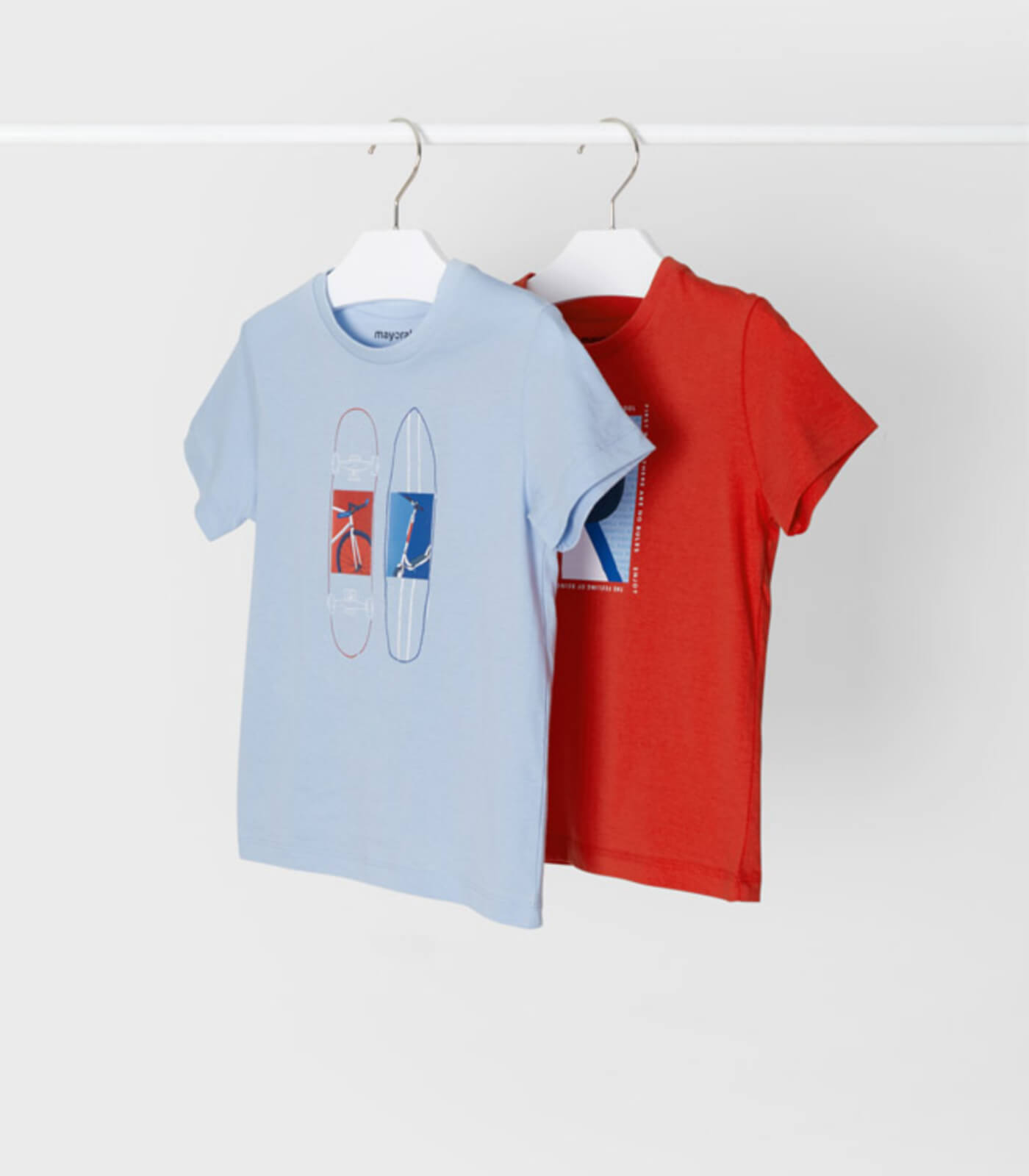 Camiseta de mangas cortas para niños desde la talla 3 hasta la 9 años, modelo en con diseño en el frontal, color celeste.