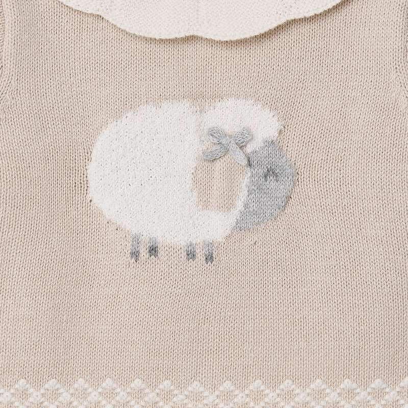 Conjunto de tres piezas, jersey de lana color topo con adorno de borreguito, braga de micropana color beig con lazo y leotardo color topo liso.