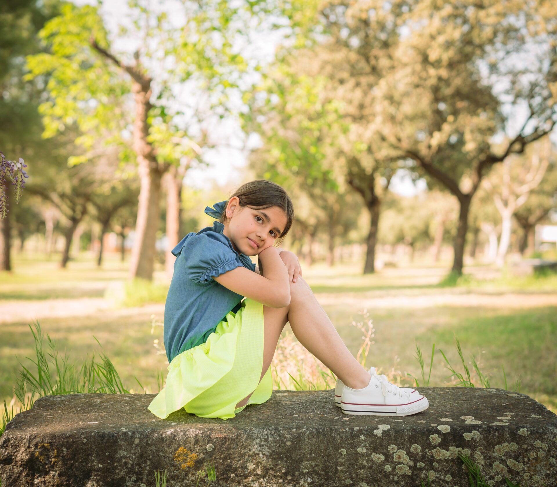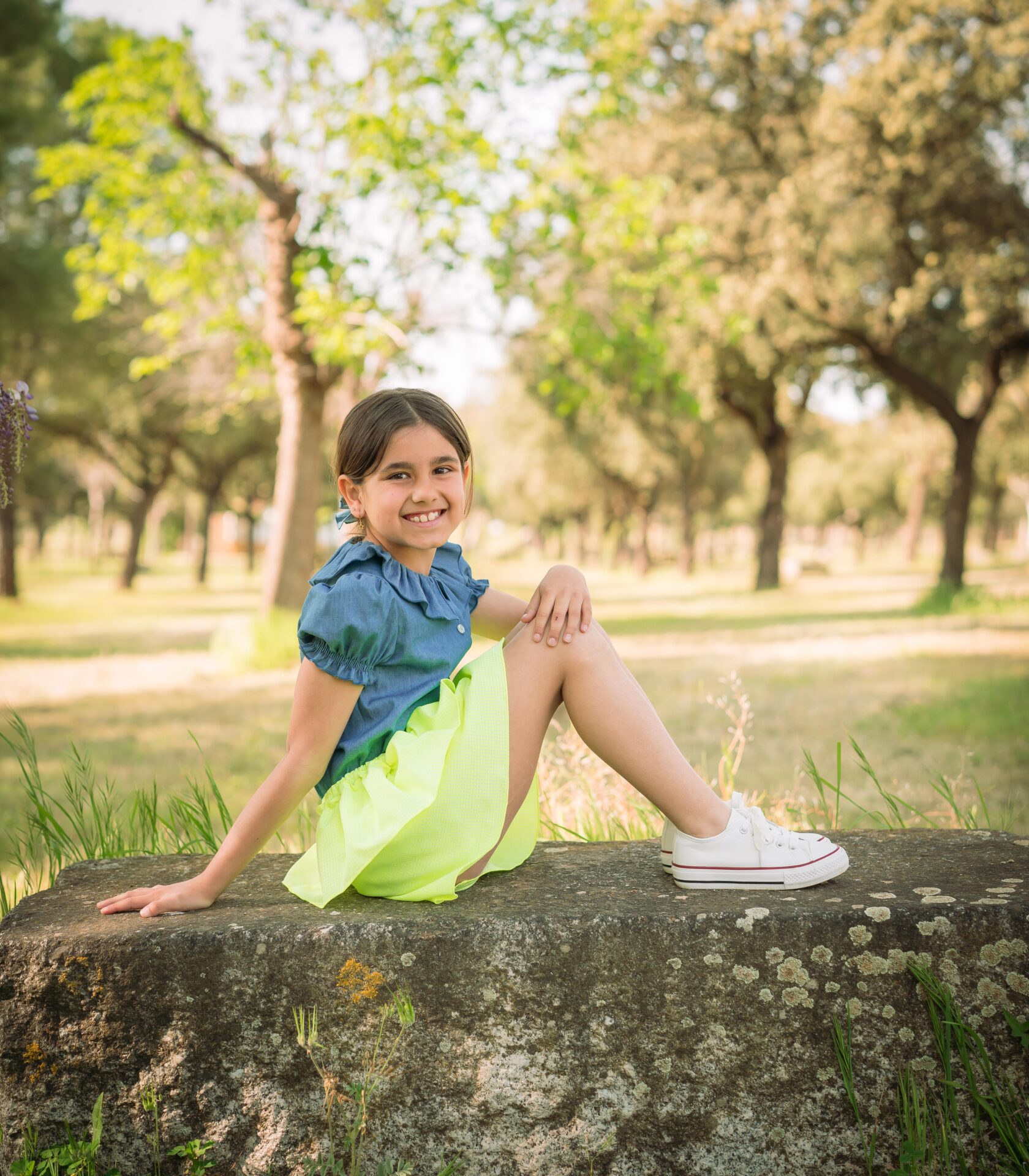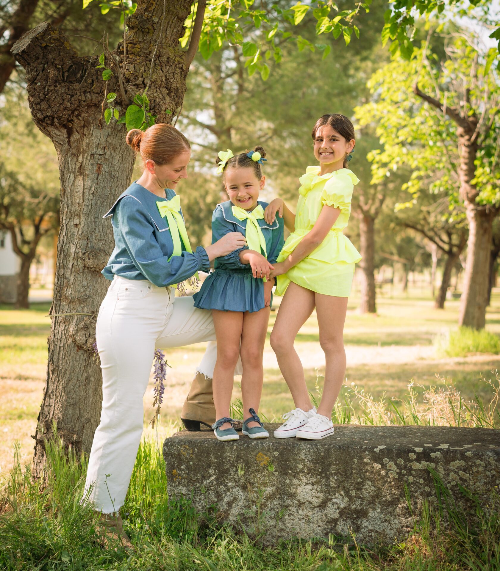 1. Falda color Vichy amarillo flúor, con elástico en la cintura y doble volante.