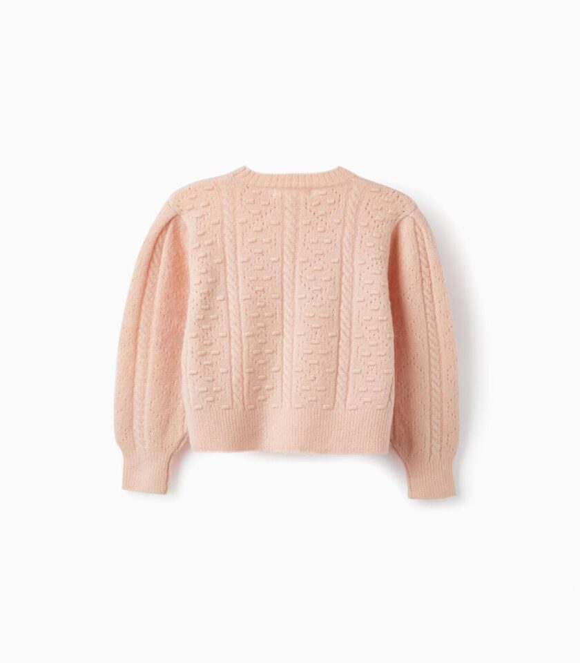 Jersey de punto rosa para niña. Punto con detalles microperforados, en relieve y entrelazados. Extremos acanalados para un mejor ajuste. Un jersey cálido, suave y cómodo, perfecto para los días fríos.