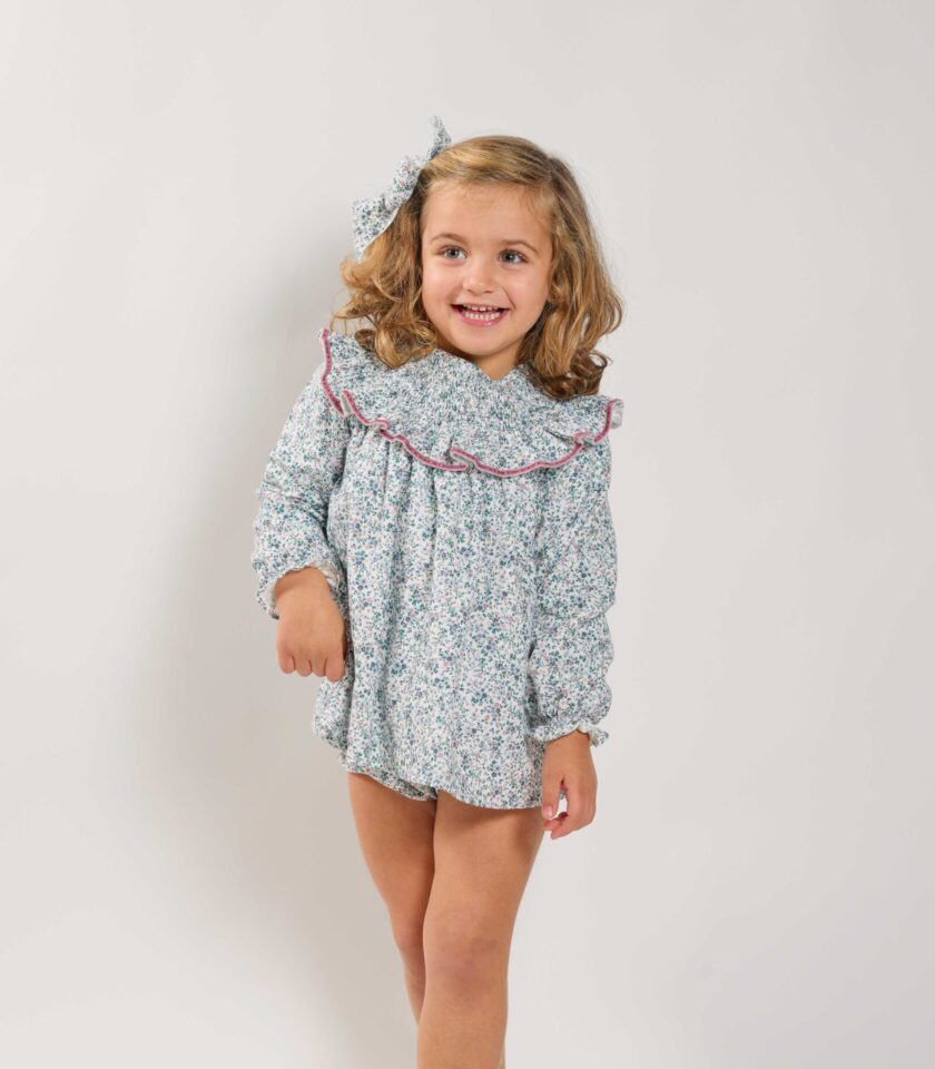 Jesusín con braguita, estampado flores violetas, cuello fruncido con detalle de cinta aterciopelada decorativa.