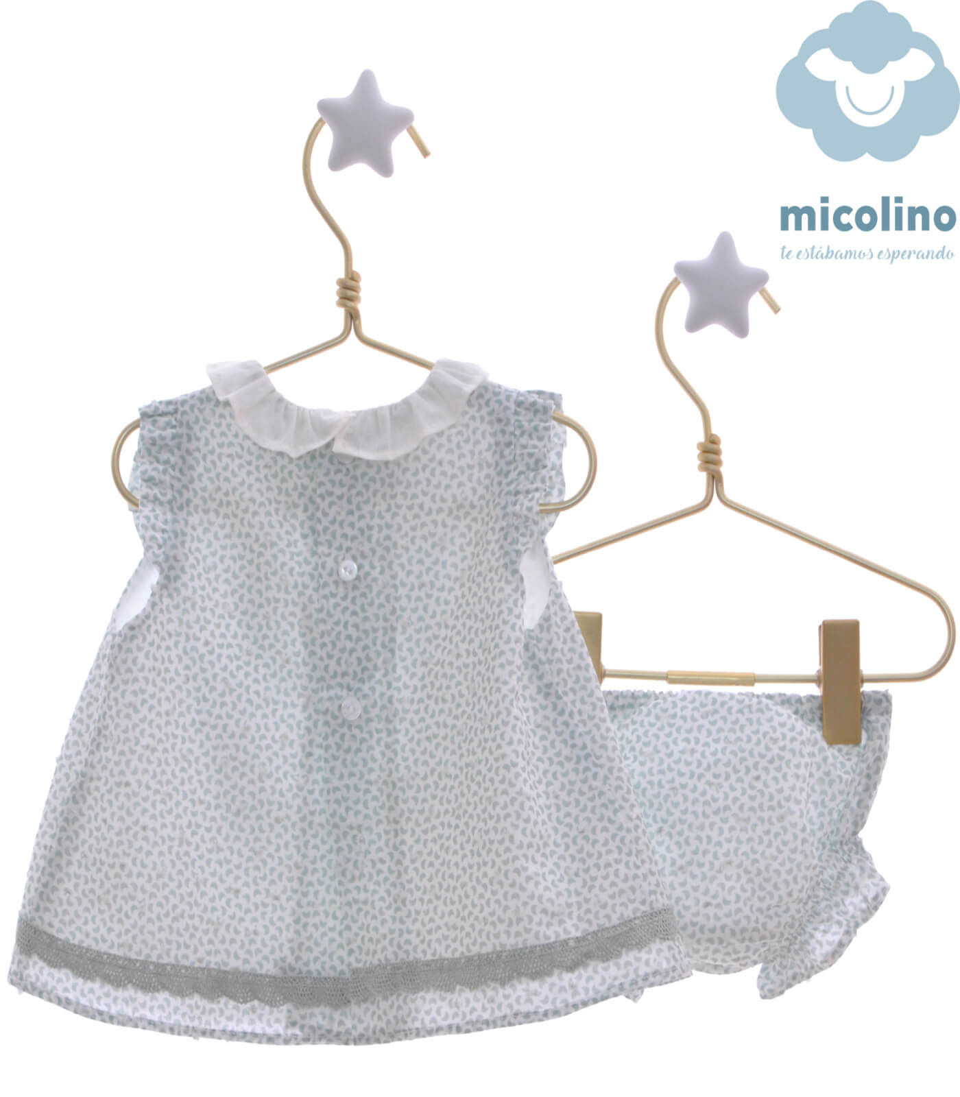Jesusin de la colección primavera verano de Micolino compuesto de vestidin, Capota y braguita de tela.