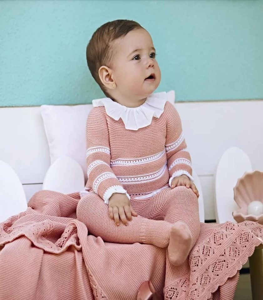 Delicado conjunto de 3 piezas compuesto de jersey de manga larga de tricot con pasacintas calados, polaina y gorrito a juego, todo ello de color rosa emoplvado. El jersey cierra con botones en la espalda.