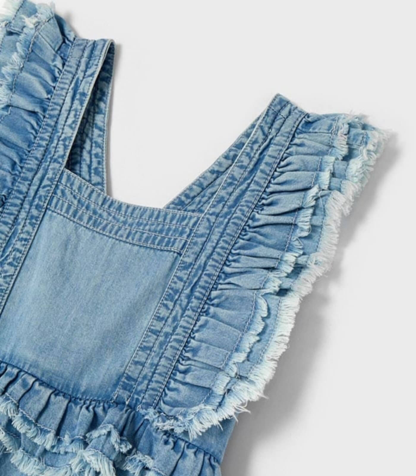 Mono corto en tejido vaquero claro con diseño de volates en la parte superior, cierre con cremallera trasera.