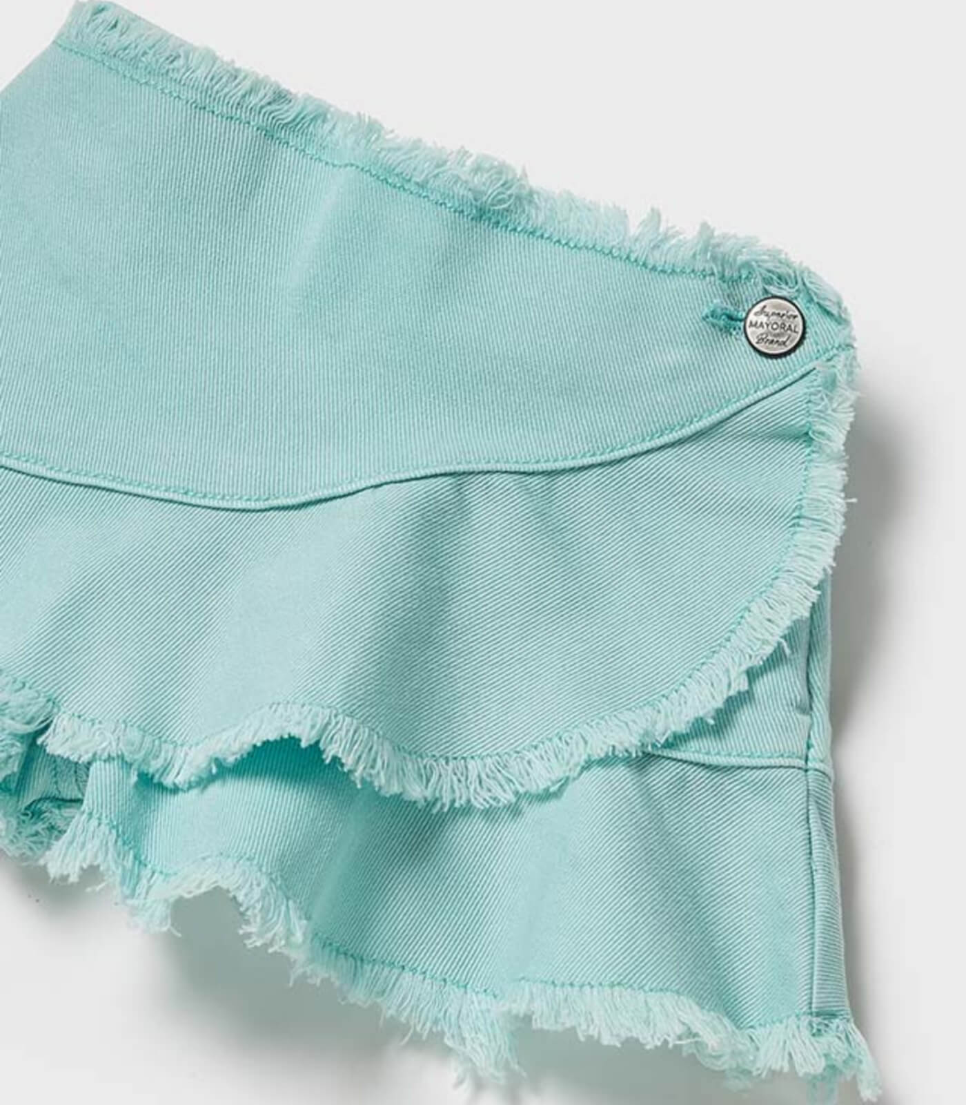 Pantalón corto volante en tono verde agua para bebe niña de 6 a 36 meses, botones en la cintura para un mayor ajuste.