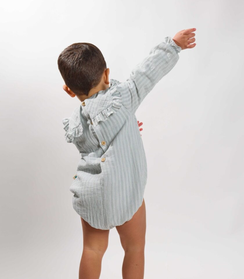 Pelele mil rayas color verde agua. Colección Rayitas, cuello cuadrado, cierre abotonado en la entrepierna para facilitar la puesta del pañal. Botones de madera.