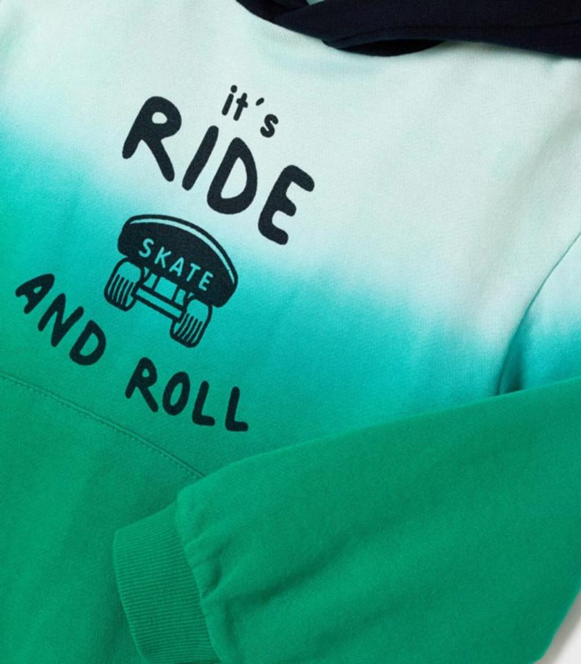 Sudadera con tejido fino de primavera en color verde agua con degradado en tono blanco y con letras decorativas en el frontal tallas desde la 3 a la 9 años.