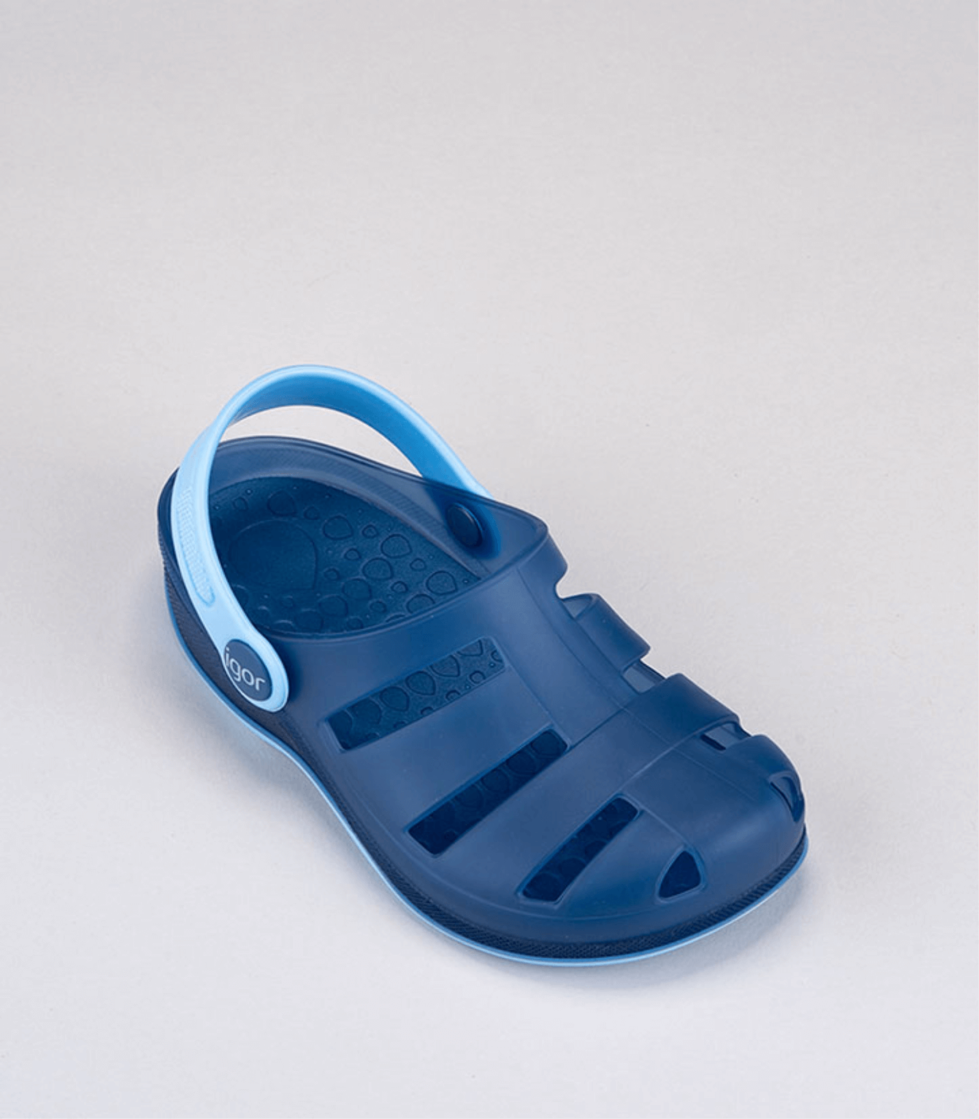 Zueco traslúcido bicolor con plantilla confort extraíble y tira en el talón para mayor sujección.