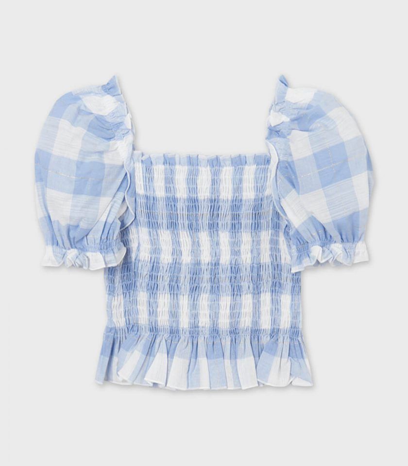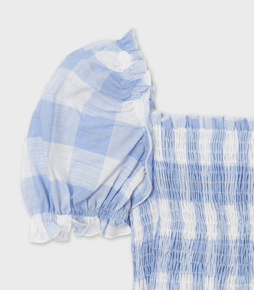 Blusón de manga corta para chica de 8 a 16 años con detalles al tono. Cuello cuadrado. Diseño con volante decorativo en el bajo de la prenda. Elementos de adorno: detalles fruncidos con nido de abeja. Motivo de cuadros.